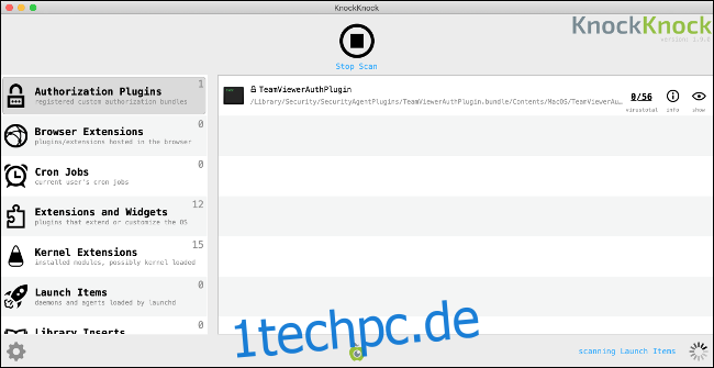 Ein weiteres nützliches Tool zur Erkennung von Malware ist KnockKnock von Objective-See. KnockKnock zielt nicht direkt auf Malware ab, sondern auf Software, die sich dauerhaft auf dem System installiert hat. Da Malware oft aggressive Methoden verwendet, um auf einem Computer zu bleiben, findet und analysiert KnockKnock diese Prozesse.