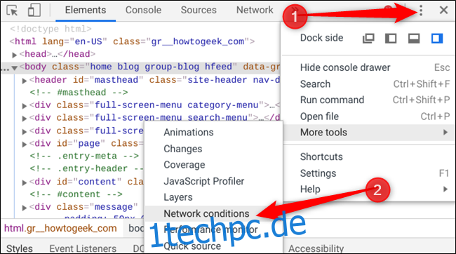 Sollte diese Option nicht sichtbar sein, klicken Sie auf das Menüsymbol in den Entwicklertools und wählen „Weitere Tools“ > „Netzwerkbedingungen“, um sie zu aktivieren.