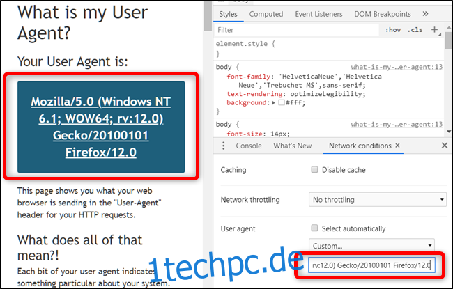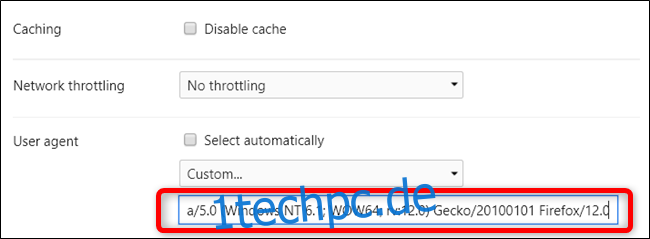 Wenn Sie einen bestimmten User-Agenten nutzen möchten, der nicht in der Liste enthalten ist, können Sie dessen Code kopieren und in das darunterliegende Textfeld einfügen.