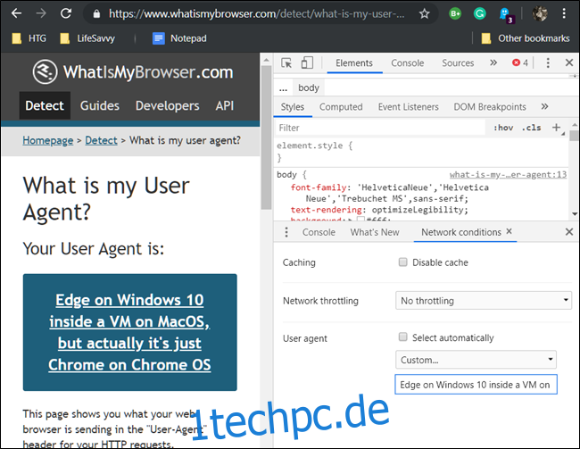 Sobald Sie diese Einstellungen vorgenommen haben, rufen Sie eine beliebige Webseite auf, während die Entwicklertools für diese Seite noch geöffnet sind. Der User-Agent wird nun der von Ihnen ausgewählten Konfiguration entsprechen. Diese Änderung bleibt so lange aktiv, bis die Entwicklertools geschlossen werden.