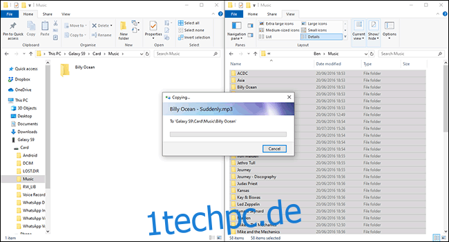 Öffnen Sie nun Ihren Musikordner und ziehen Sie die gewünschten Dateien auf Ihr Android-Gerät, in das Verzeichnis, in dem Sie Ihre Musiksammlung speichern möchten. Je nach Anzahl der Dateien kann dieser Vorgang eine Weile dauern.