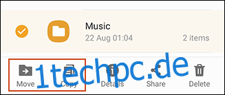 Wählen Sie Ihre Musikdateien (oder den Ordner mit Ihren Dateien) aus und entscheiden Sie, ob Sie sie kopieren oder verschieben möchten. Navigieren Sie von Ihrem USB-Speicher entweder zum internen Speicher oder zur SD-Karte Ihres Geräts und fügen Sie die Dateien dort ein oder verschieben Sie sie.