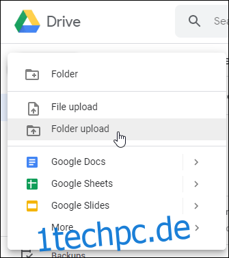 Beginnen Sie, indem Sie Ihre Musik auf Google Drive im Web hochladen. Klicken Sie oben links auf „Neu“ und wählen Sie „Datei-Upload“, um einzelne Dateien hochzuladen, oder „Ordner-Upload“, um Ihre gesamte Sammlung auf einmal hochzuladen.