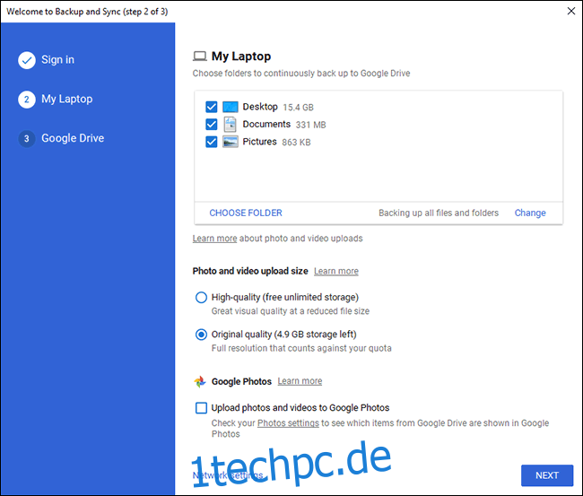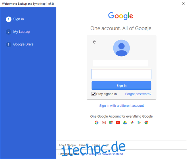 Sie können auch Google Backup und Sync verwenden, um Dateien von Ihrem PC zu synchronisieren. Laden Sie das Installationsprogramm herunter, öffnen Sie es nach der Installation und klicken Sie auf „Erste Schritte“. Sie werden aufgefordert, sich bei Ihrem Google-Konto anzumelden.