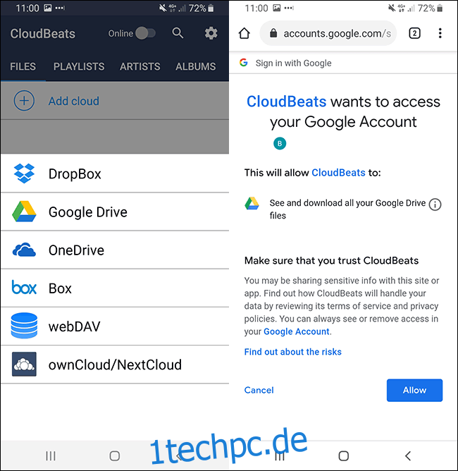 Klicken Sie auf „Cloud hinzufügen“ und wählen Sie Google Drive. Sie werden gefragt, ob Sie CloudBeats den Zugriff auf Ihr Google-Konto erlauben möchten – wählen Sie „Zulassen“.