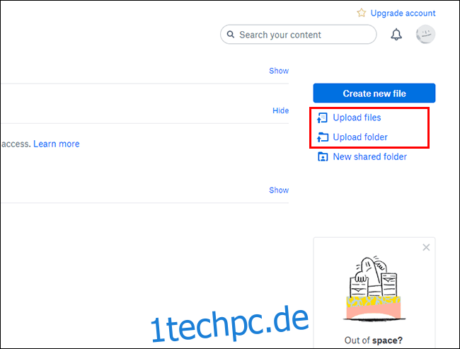 Das Hochladen von Dateien auf Dropbox ist einfach. Gehen Sie zur Dropbox-Website, melden Sie sich an und klicken Sie rechts auf „Dateien hochladen“ oder „Ordner hochladen“.
