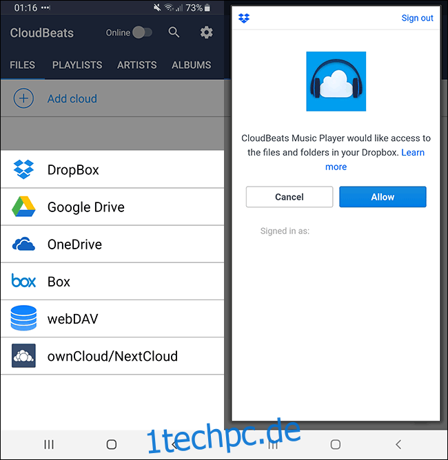 Wählen Sie „Dropbox“ und melden Sie sich mit Ihren Dropbox-Anmeldedaten an. Sie werden gefragt, ob Sie CloudBeats den Zugriff auf Ihre Dropbox-Dateien und -Ordner gestatten möchten. Klicken Sie auf „Zulassen“.