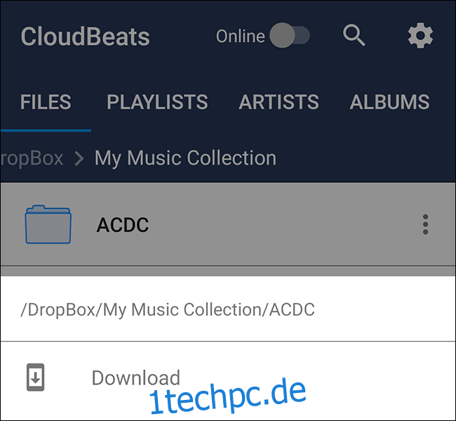 Ihre Dropbox-Ordner sollten nun in der App angezeigt werden. Suchen Sie den Ordner mit Ihrer Musiksammlung, klicken Sie auf die Menüoption neben dem Ordner und klicken Sie auf „Herunterladen“.