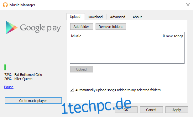 Wenn der Musik Manager diese Ordner durchsucht hat, beginnt er, Ihre Dateien auf Google Play Music hochzuladen. Sie können dann über die Google Play Music App auf Ihrem Smartphone oder über Ihren PC auf der Google Play Music Website darauf zugreifen.