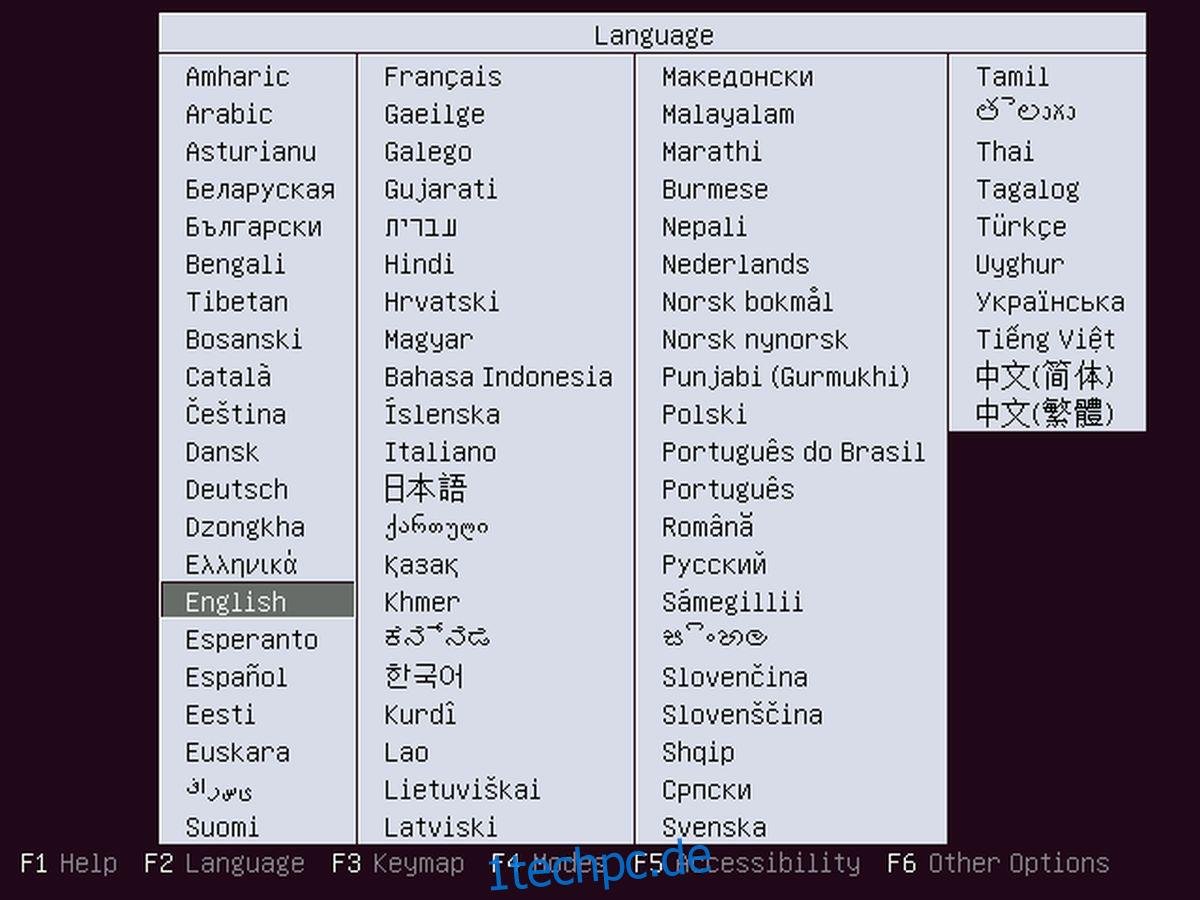 Wähle die gewünschte Sprache aus und drücke die Eingabetaste. Wähle auf der nächsten Seite „Ubuntu Server installieren“.
