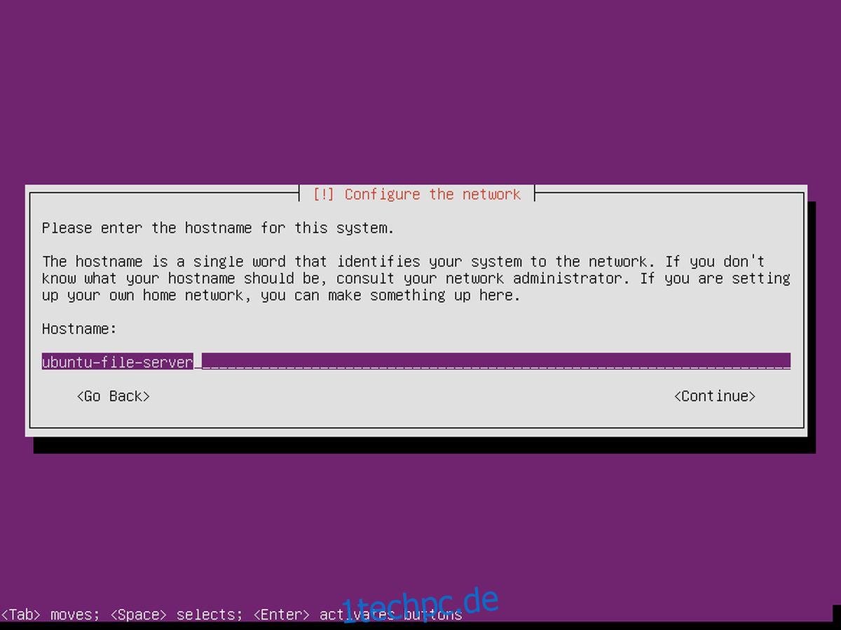 Nach einigen Seiten, z.B. zur Auswahl der Region, fordert Ubuntu auf, das Gerät zu benennen und einen neuen Benutzer anzulegen. Gib den Hostnamen für den Server ein.
