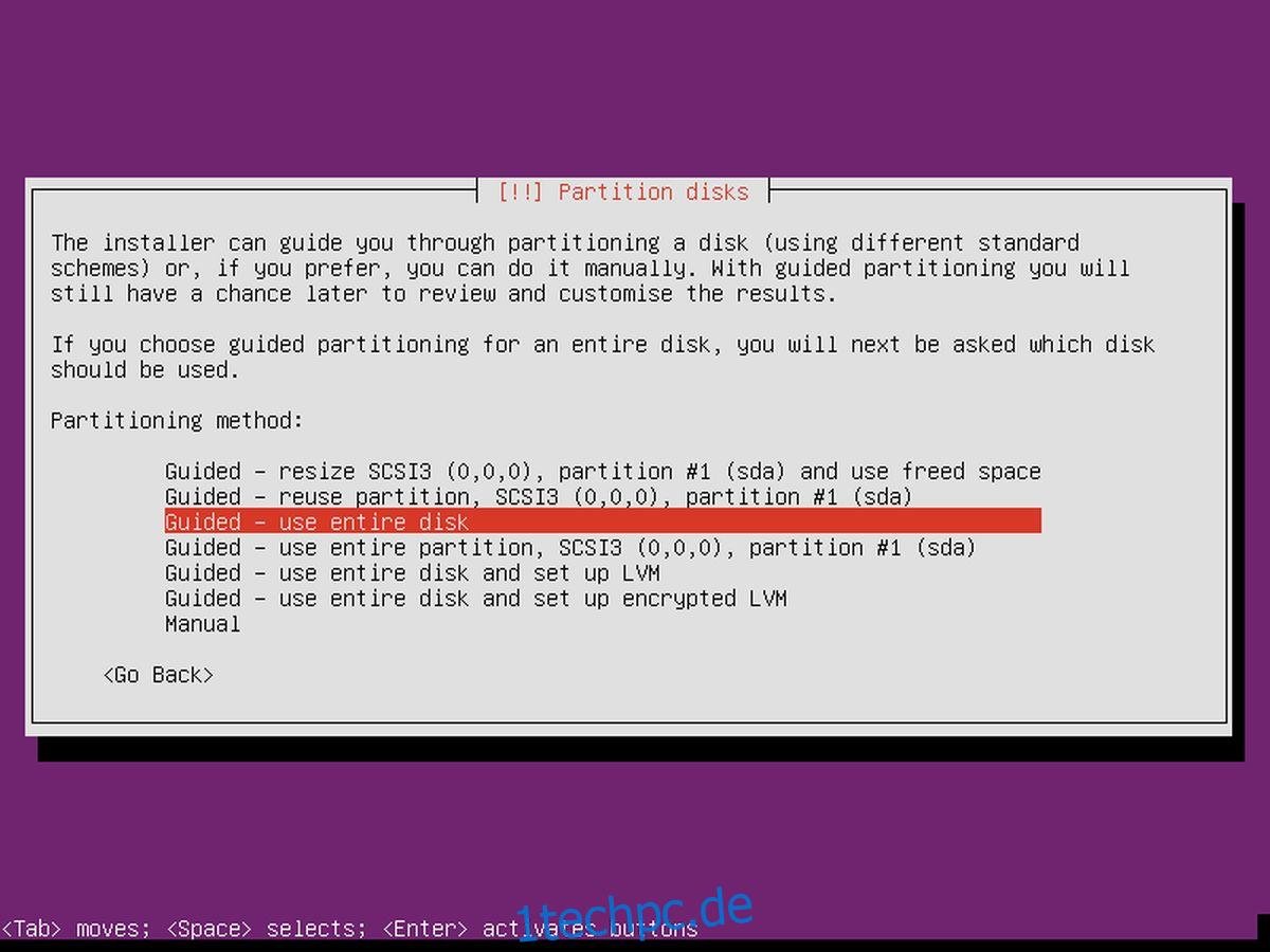 Nachdem das Setup konfiguriert ist, kann die eigentliche Installation beginnen. Wähle im Partitionierungsmenü „Geführt – gesamte Festplatte verwenden“. Der Installationsprozess wird gestartet und kann einige Zeit dauern. Habe Geduld.
