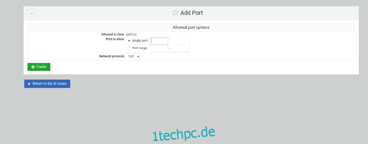 Schritt 2: Nachdem Sie auf „Zulässigen Port hinzufügen“ geklickt haben, öffnet FirewallD das Dialogfenster „Zulässige Portoptionen“. Wählen Sie hier „Einzelner Port“ und tragen Sie den Port in das Feld ein. Wenn es sich um einen Portbereich handelt, geben Sie den Bereich im Abschnitt „Portbereich“ an.