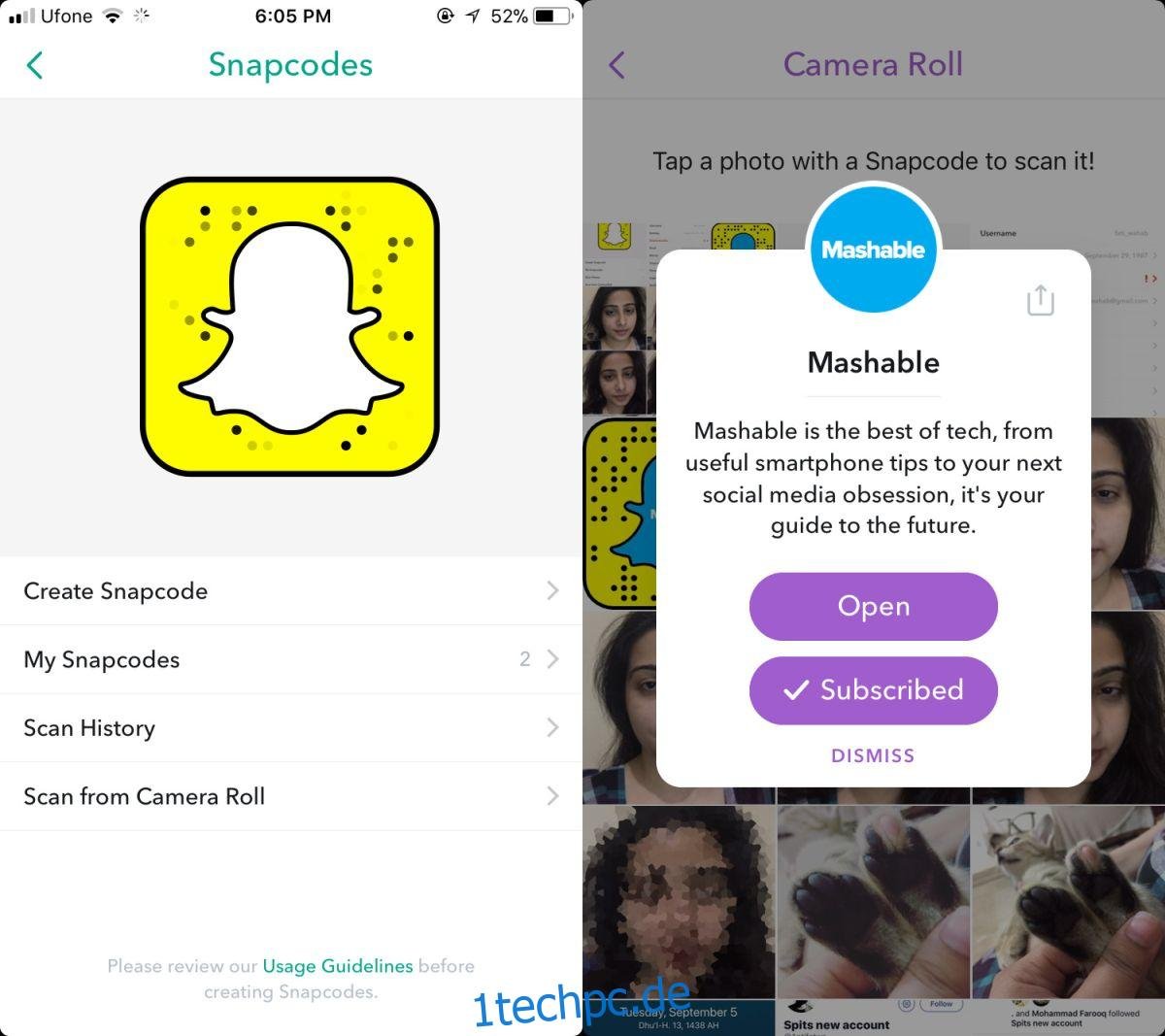 Auf dem Snapcode-Bildschirm finden Sie die Option „Aus Kamerarolle scannen“. Tippen Sie darauf und wählen Sie anschließend das Bild aus, das den Snapcode enthält, aus Ihrer Galerie. Snapchat scannt diesen Code und bietet Ihnen dann Optionen an, das zugehörige Konto zu öffnen und/oder zu abonnieren.