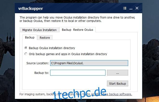 Unter „Sichern“ können Sie das Oculus-Verzeichnis auswählen und an einem beliebigen Ort Ihrer Wahl sichern. Im Gegensatz zur Migration werden hierbei die Dateien kopiert, und der ursprüngliche Installationsort bleibt unverändert.
