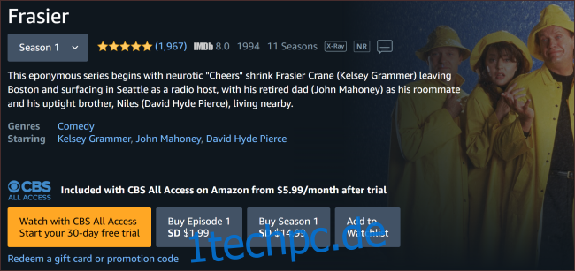 Auf Amazon Prime Video können Sie Frasier Ihrer Bibliothek hinzufügen und die Serie unterwegs oder zu Hause genießen. Die Staffeln eins bis zehn sind für jeweils 15 US-Dollar erhältlich, Staffel elf kostet 20 US-Dollar, und einzelne Episoden sind für 2 US-Dollar verfügbar. So können Sie von überall auf die Serie zugreifen.