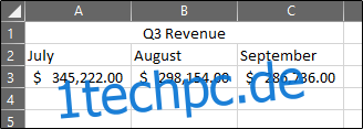 Was passiert nun, wenn wir Zellen verbinden, die bereits Inhalte enthalten? Hier ist Vorsicht geboten. Wenn Sie Zellen zusammenführen, die bereits Daten beinhalten, bleibt nur der Wert der oberen linken Zelle erhalten, alle anderen Werte werden verworfen. Das heißt, alle Daten außer den Daten in der oberen linken Zelle gehen verloren. Microsoft gibt Ihnen zwar eine Warnmeldung, bevor Sie die Zellen zusammenführen, aber Sie sollten sich im Klaren sein, dass Daten verloren gehen, bevor Sie fortfahren.