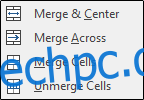 Wie Sie sehen, wurden die Zellen A1, B1 und C1 zu einer einzigen Zelle zusammengefasst. Es gibt zudem weitere Auswahlmöglichkeiten. Um auf diese Optionen zuzugreifen, klicken Sie auf den Pfeil neben „Verbinden und zentrieren“; ein Dropdown-Menü erscheint.